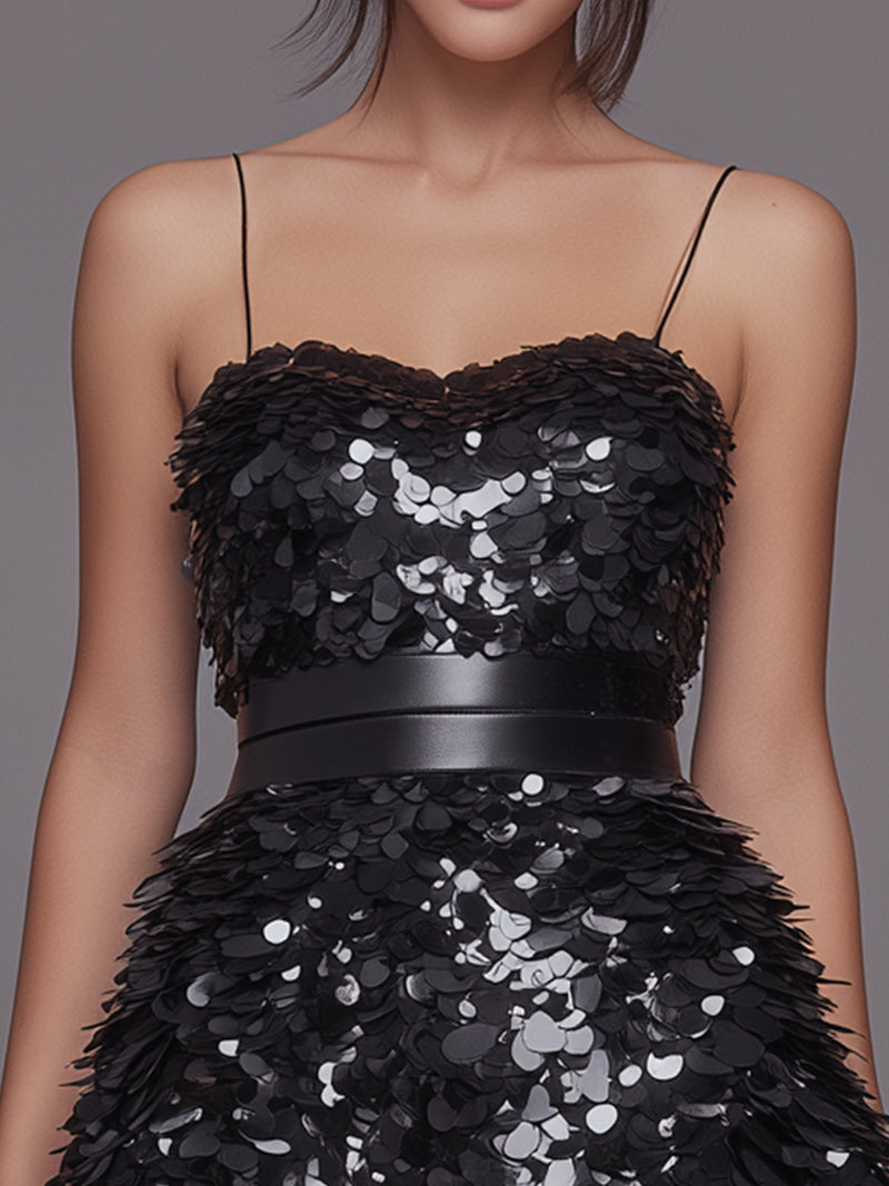 Layered Petal-Sequin Spaghetti-Strap Mini Dress