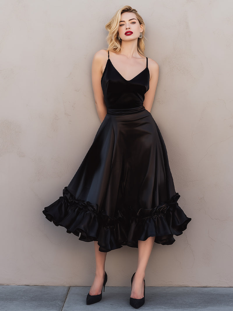 Satin Ruffled Midi Dress With Spaghetti Straps