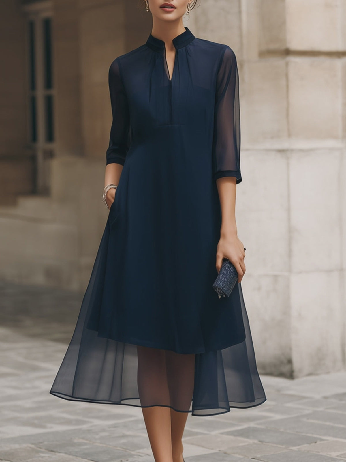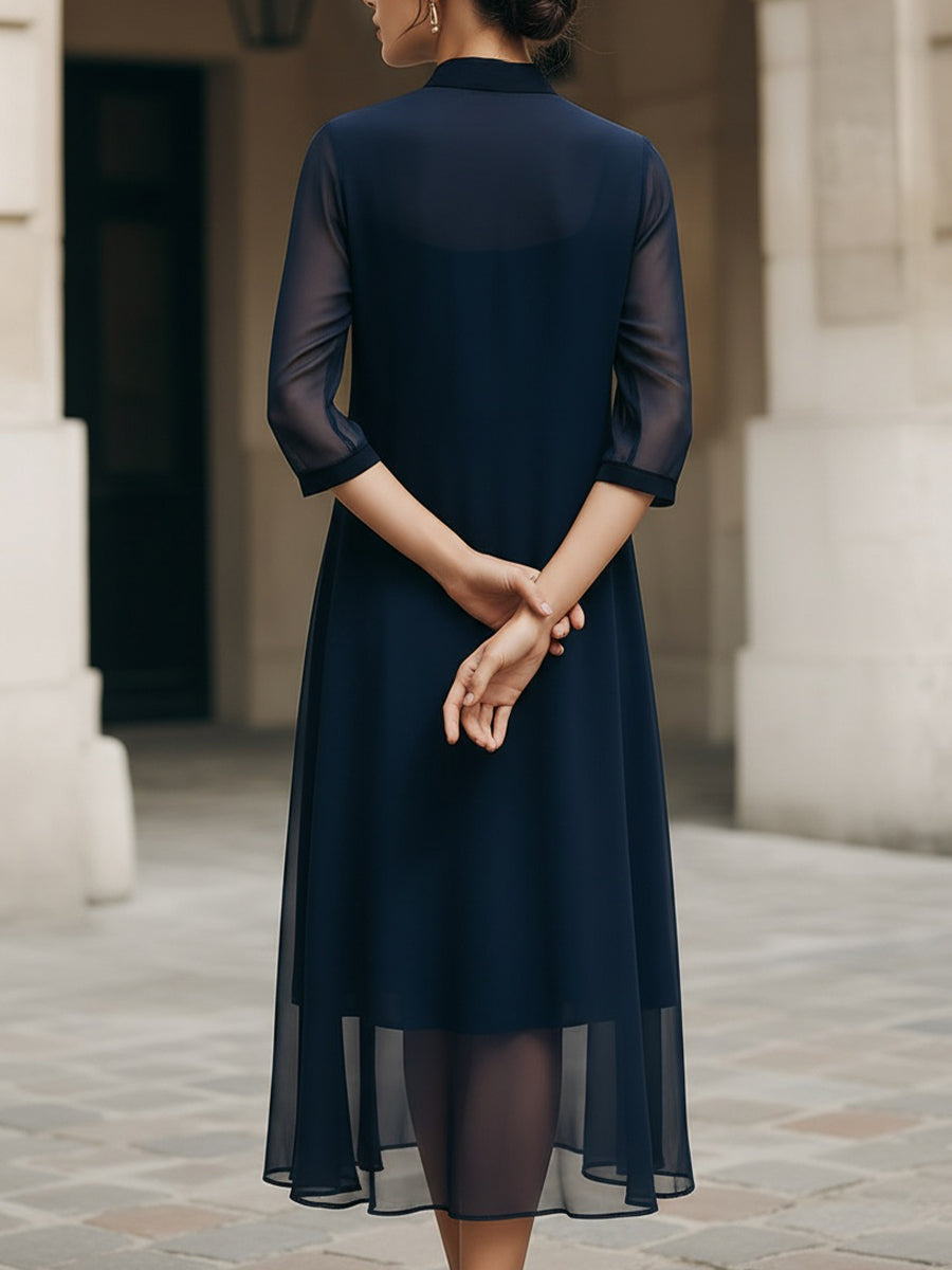 • Design: Mandarin collar with split neckline, semi-sheer three-quarter sleeves, layered sheer overlay, softly flared midi silhouette