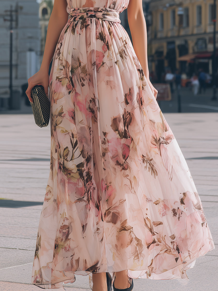 - Design: Sleeveless silhouette with softly gathered ruffled neckline, draped bodice, adjustable waist tie, and flowing maxi-length skirt with all-over floral pattern