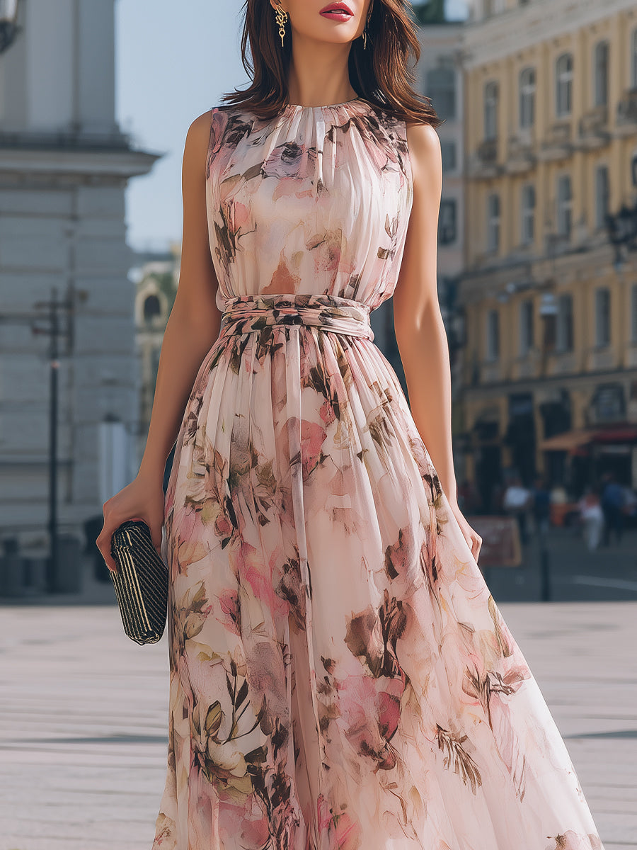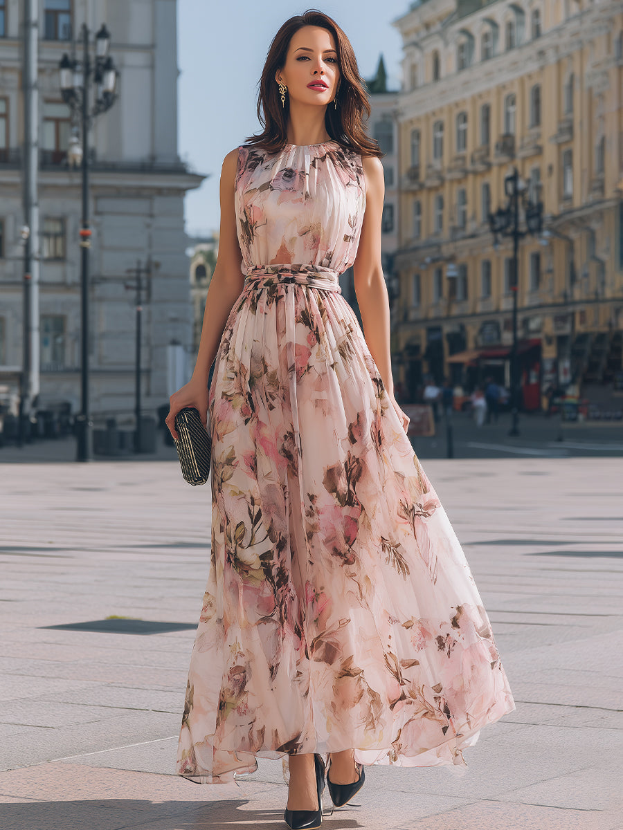 Mooyius presents an elegant maxi dress designed to embody graceful femininity through soft movement and refined detailing. This sleeveless silhouette features a delicately gathered high neckline finished with subtle ruffle trim, creating a romantic frame that highlights the shoulders and neckline with effortless sophistication. The bodice gently drapes over the upper body, forming soft pleats that add texture and dimension while maintaining a polished and balanced profile. A coordinating waist tie defines the midsection with gentle structure, enhancing the natural silhouette before flowing into a sweeping full-length skirt. The airy skirt moves beautifully with each step, creating fluid motion and an ethereal presence. An all-over floral motif brings artistic charm to the design, blending delicate botanical elements with a light, graceful aesthetic that feels timeless yet modern.
