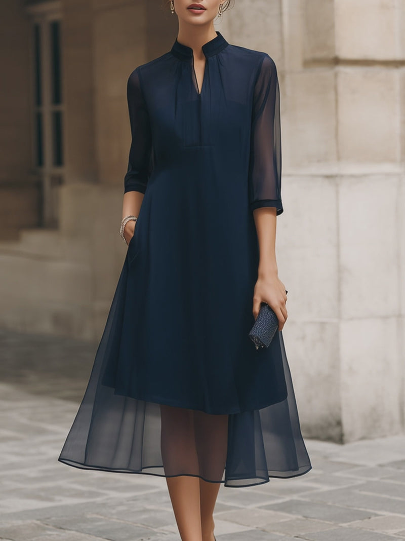Mandarin Collar Sheer Overlay Midi Dress
