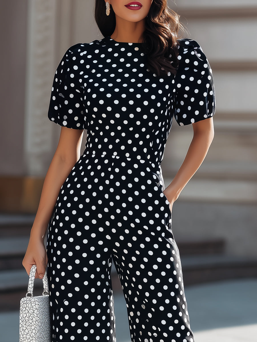 Crafted for the modern woman who embraces retro-inspired charm and timeless allure, this jumpsuit redefines contemporary style with a striking, figure-flattering silhouette. It features a sleek round neckline, short puff sleeves, a tailored bodice with a cinched waist, and flowing wide-leg trousers, all in a classic black base with white polka dots that exudes enduring confidence.