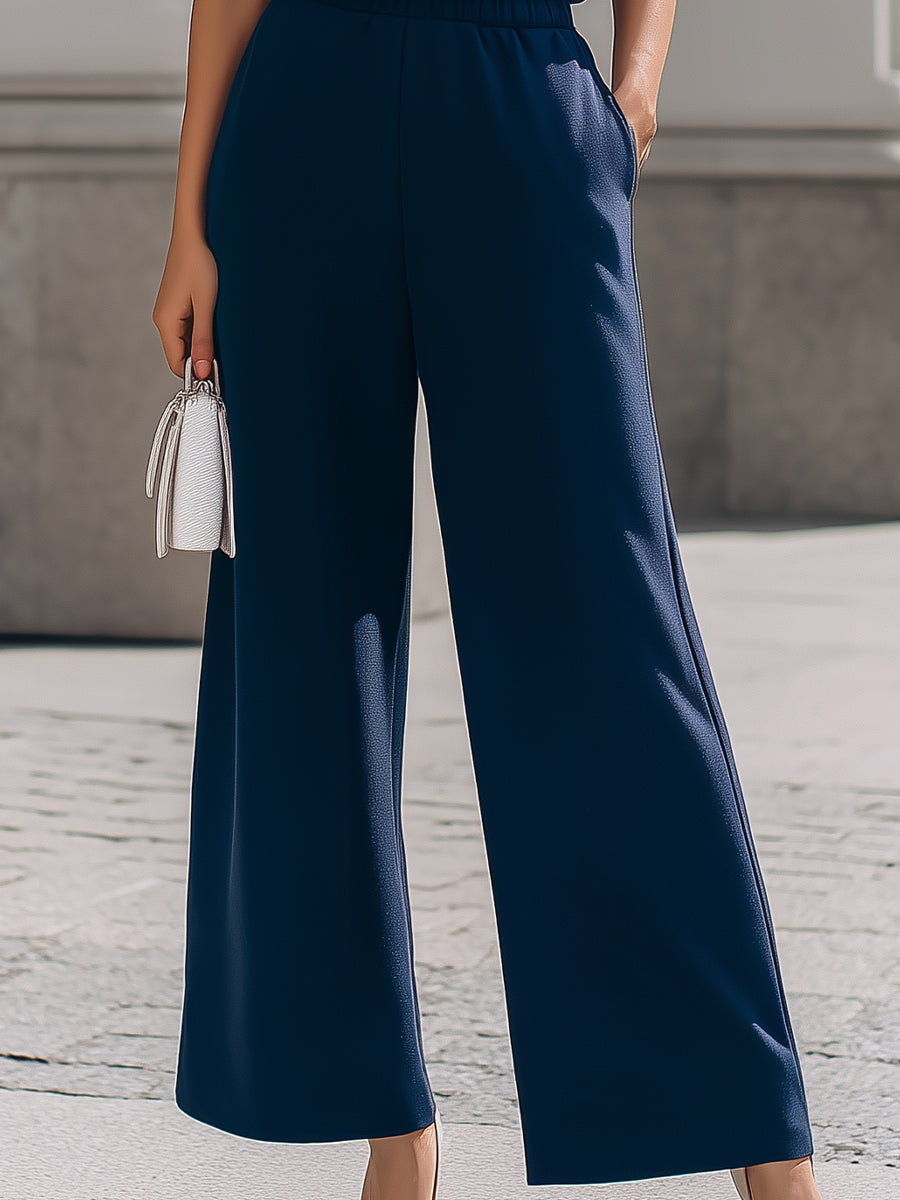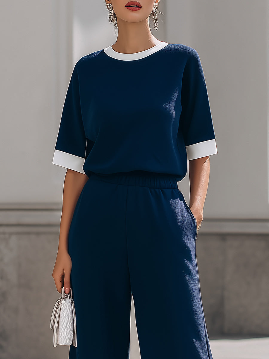 Crafted for the modern woman who balances casual polish and effortless comfort, this navy two-piece set is a versatile staple for everyday wear, city walks, and relaxed outings. It features a soft knit short-sleeve top with crisp white contrast trim at the neckline and cuffs, paired with matching high-waisted wide-leg trousers with an elasticated waistband and functional side pockets. The rich navy hue exudes understated sophistication, making it a go-to piece for both casual and elevated styling.