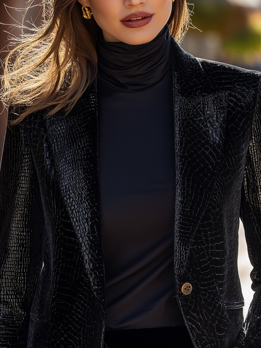 This Mooyius croc-embossed faux leather blazer elevates modern tailoring with a bold, high-gloss texture that exudes confidence and sophistication. Designed for the woman who embraces statement outerwear, the blazer features a sleek crocodile-pattern finish that catches light beautifully, enhancing depth and luxury without compromising its refined silhouette.