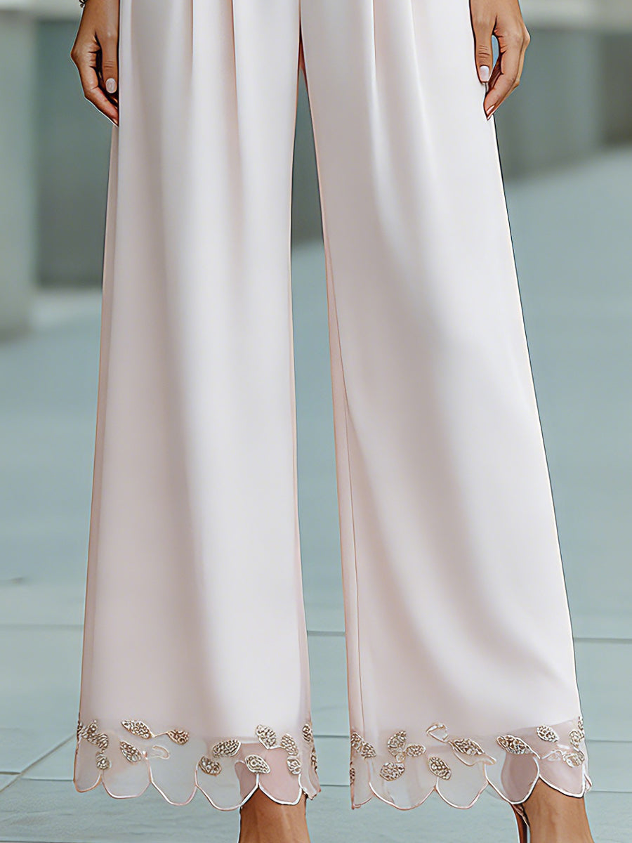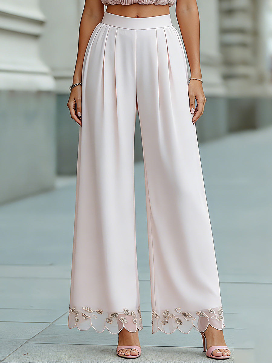 - Design: High-waisted design with soft pleated front, flowing wide-leg silhouette, elegant blush pink tone, and delicate embellished hemline for a refined feminine finish