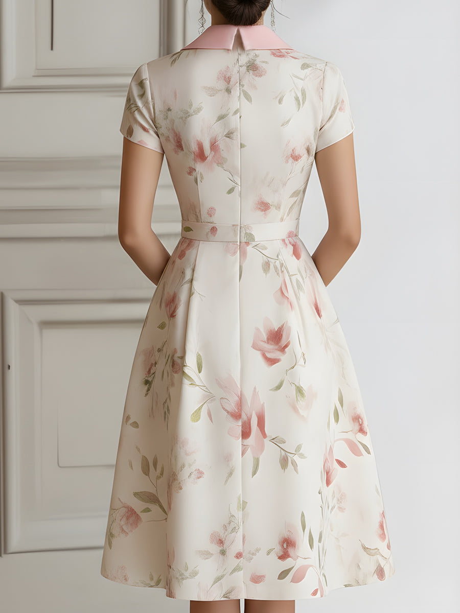 Floral Lapel Short Sleeve Midi Dress With Tailored Waist