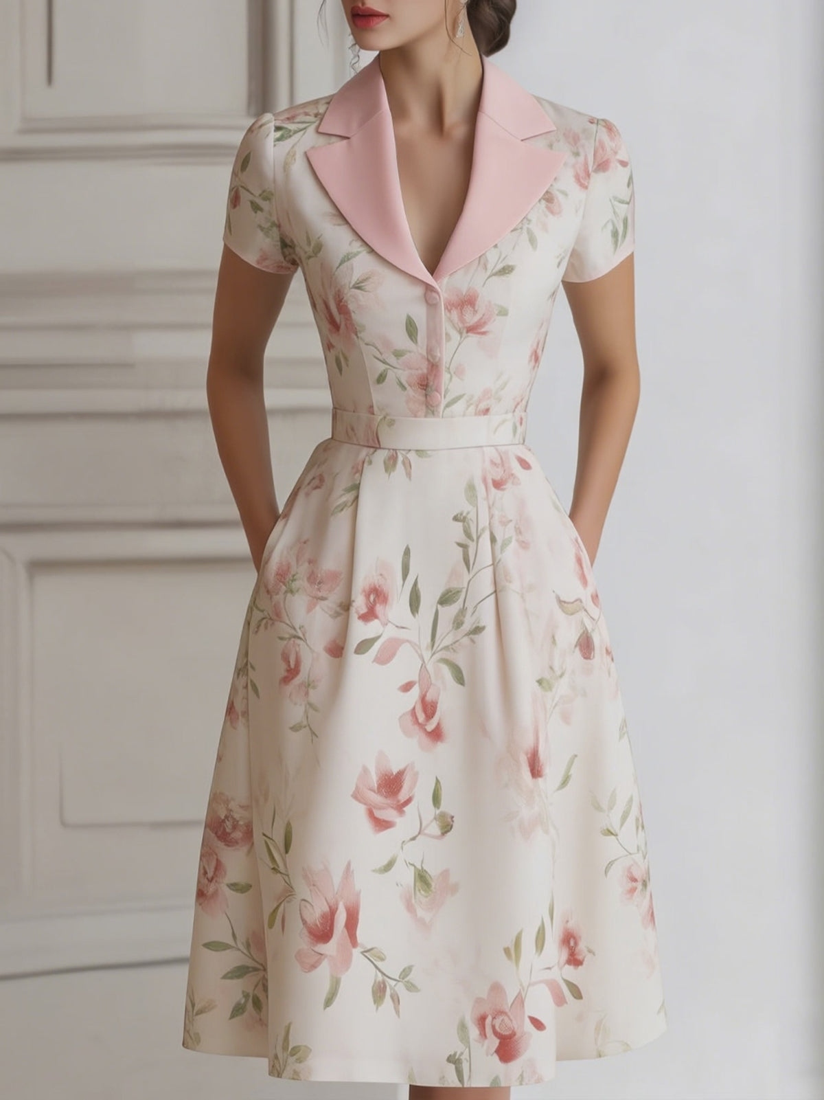 - Design:Lapel neckline, short sleeves, fitted waist, flared midi skirt, floral-patterned fabric