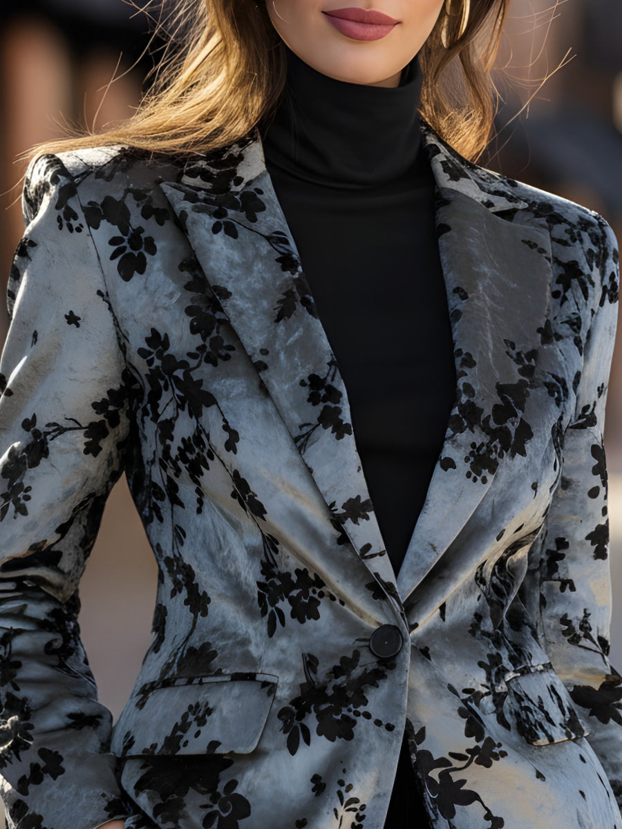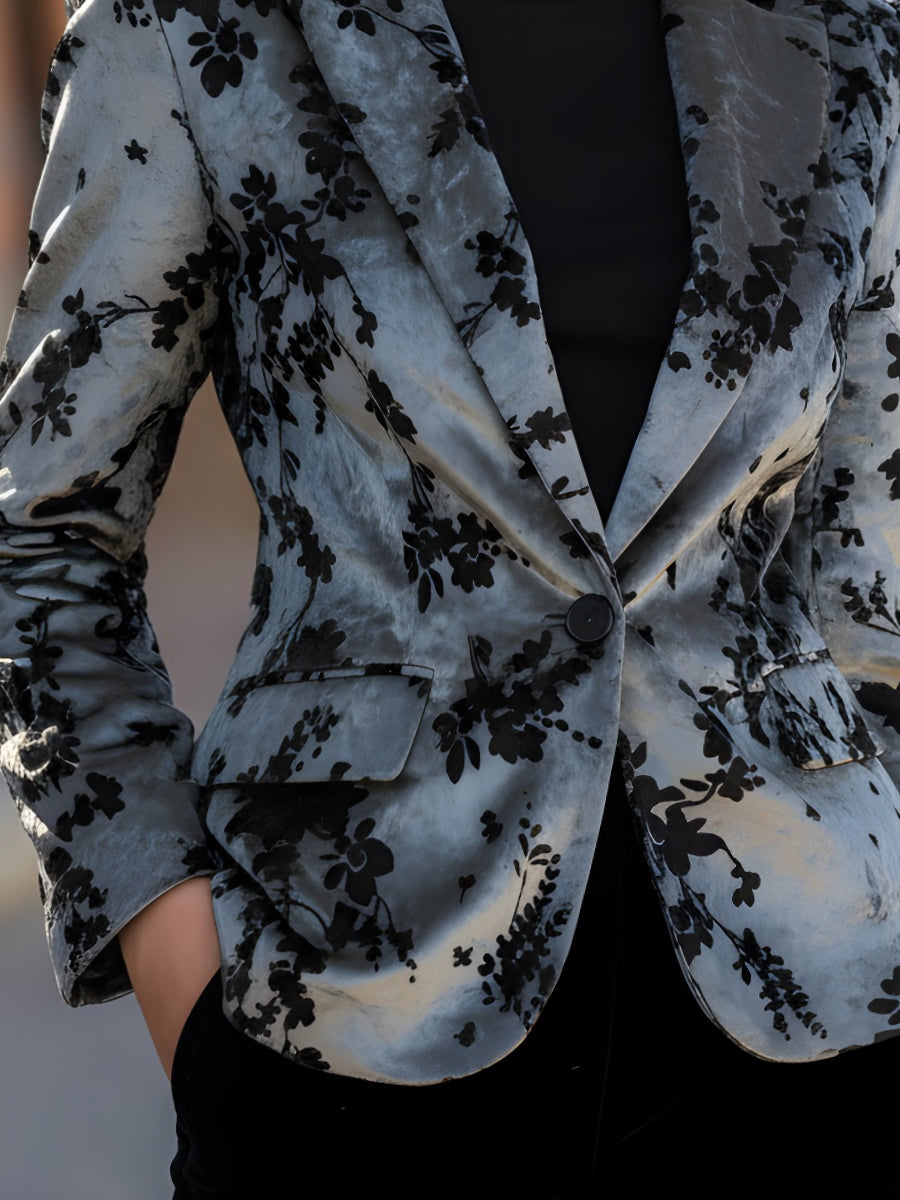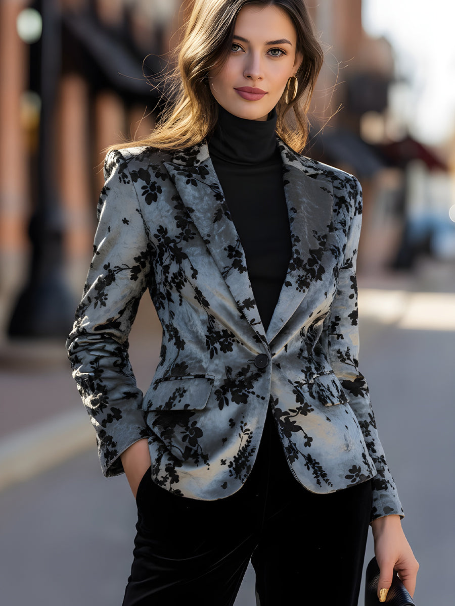 Mooyius presents a refined velvet blazer designed to bring modern elegance to everyday and evening dressing. This tailored piece features a structured silhouette with softly defined shoulders and a single-button closure that enhances the waistline. The surface is enriched with an intricate floral motif, creating a sophisticated visual dimension that elevates the classic blazer shape.