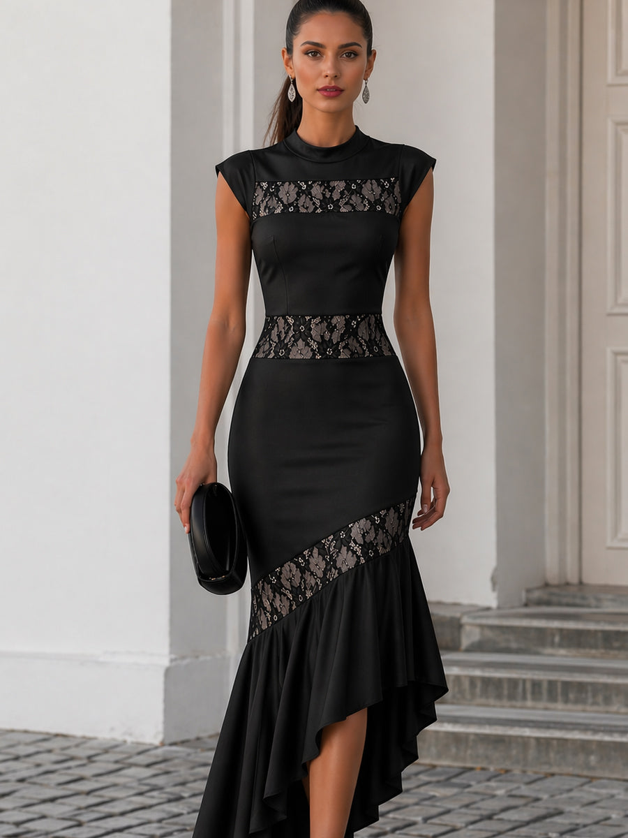 High-Neck Lace Panel Asymmetric Ruffle Maxi Dress