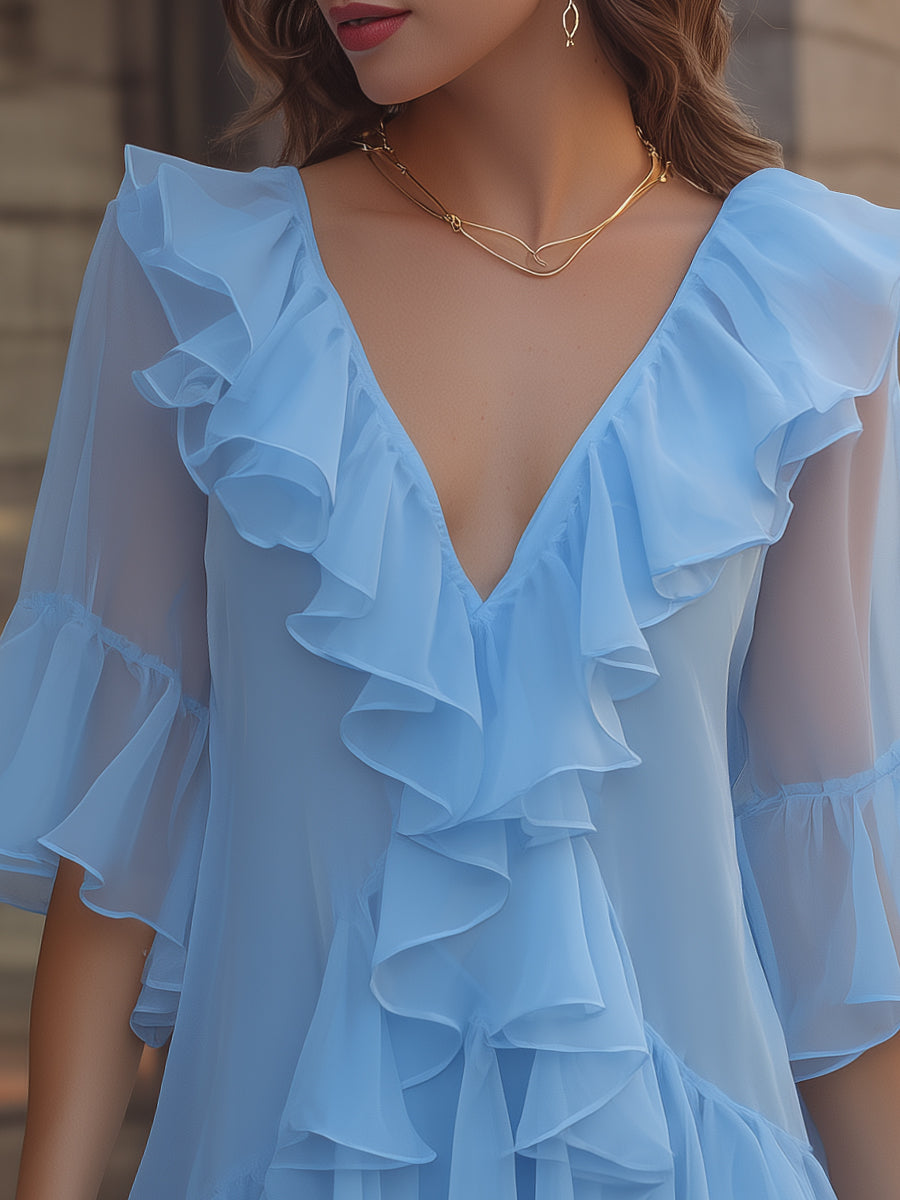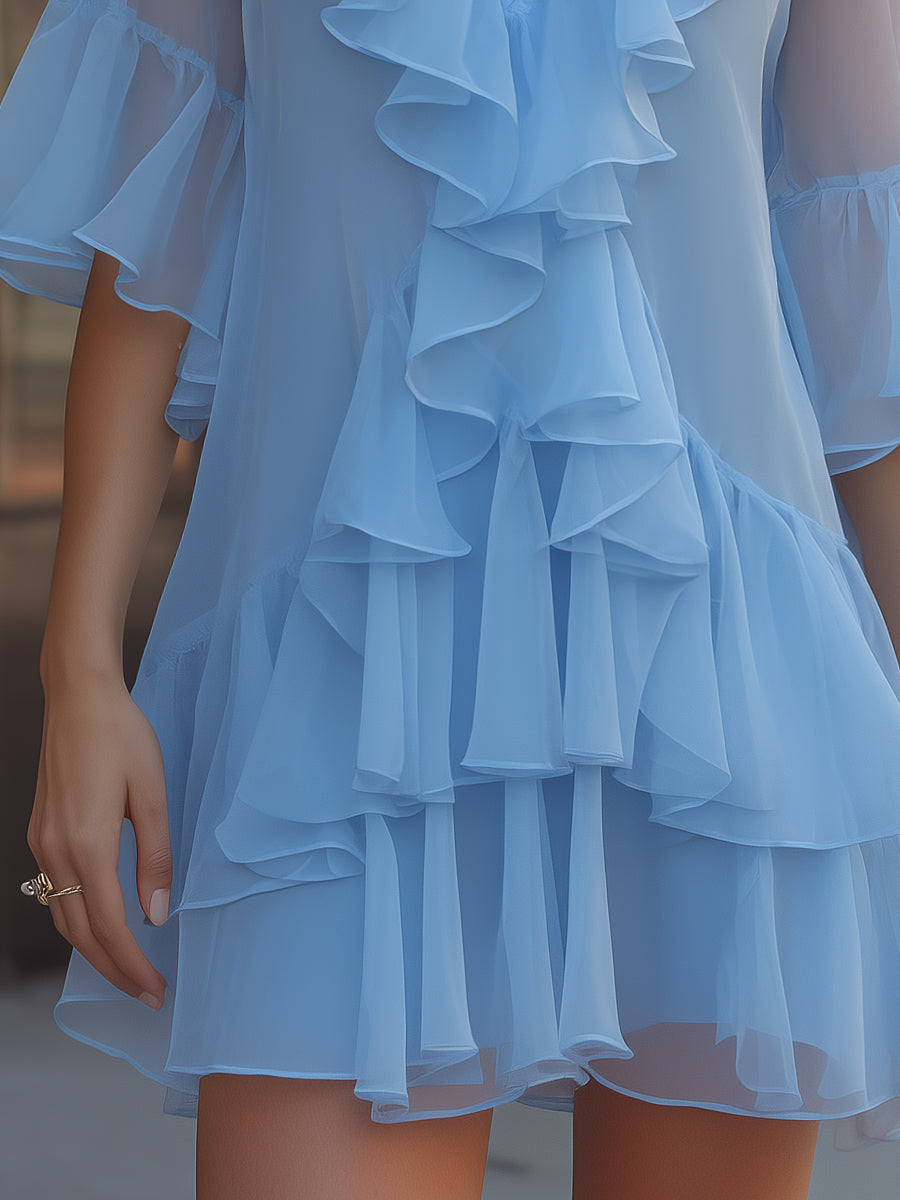 Mooyius presents a statement chiffon mini dress that captures soft romance with a playful, feminine spirit. Designed with flowing layers and delicate ruffle detailing, this piece brings movement, texture, and effortless charm to every step, making it a standout choice for warm-weather styling and elegant daytime occasions.The dress features a flattering V-neckline framed by cascading ruffles that flow gracefully along the bodice, creating a soft, dimensional look. The semi-sheer chiffon fabric enhances the airy aesthetic, offering a light and breathable feel while maintaining an elevated, refined finish.