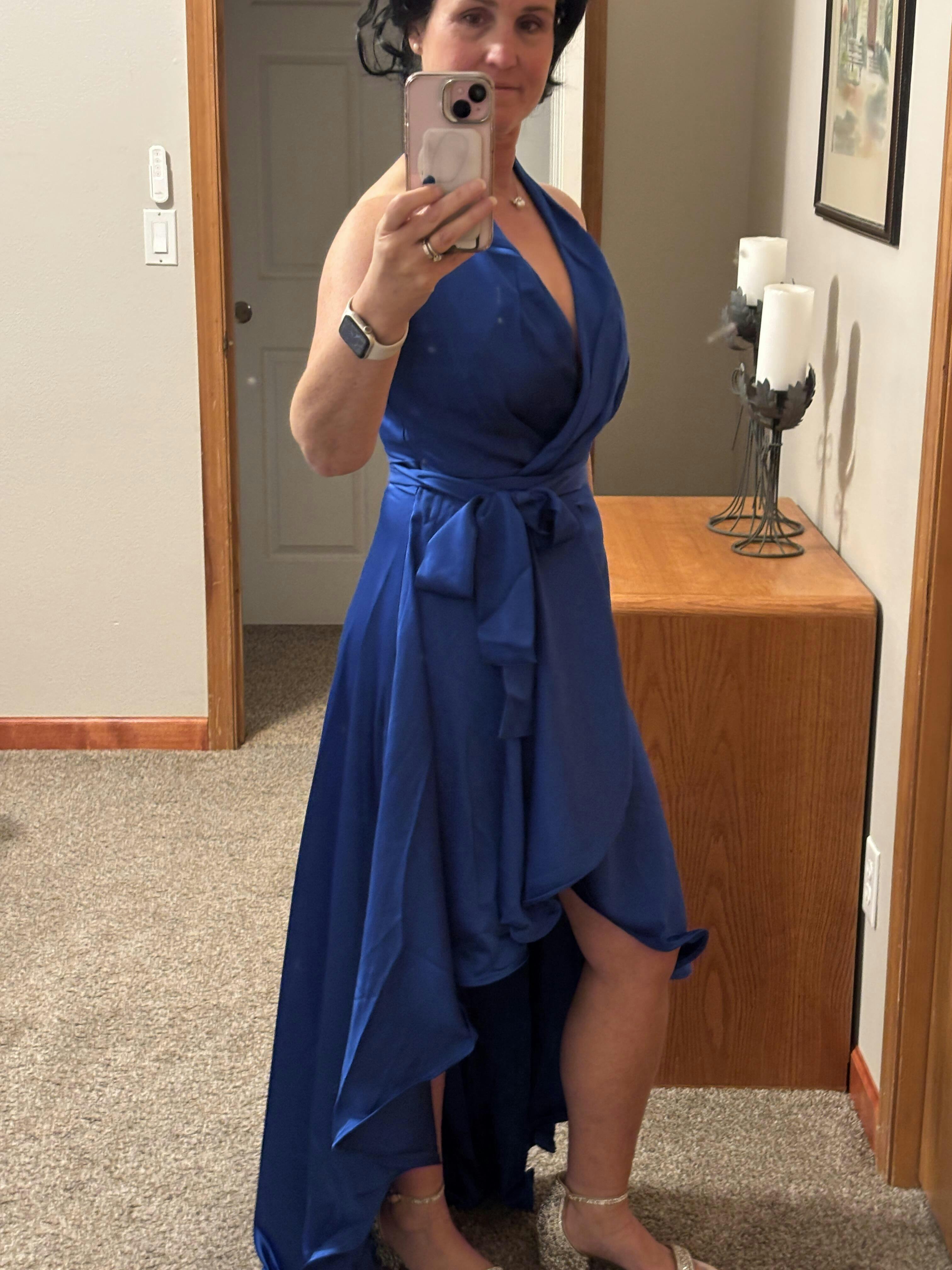 Command the evening with effortless sophistication in our Midnight Elegance Satin Halter Ruffle Gown. Crafted from luxurious deep navy satin, this gown features a plunging halter neckline that highlights the shoulders and elongates the silhouette. The bodice is thoughtfully wrapped and cinched at the waist with a soft sash tie, sculpting a flattering hourglass shape.