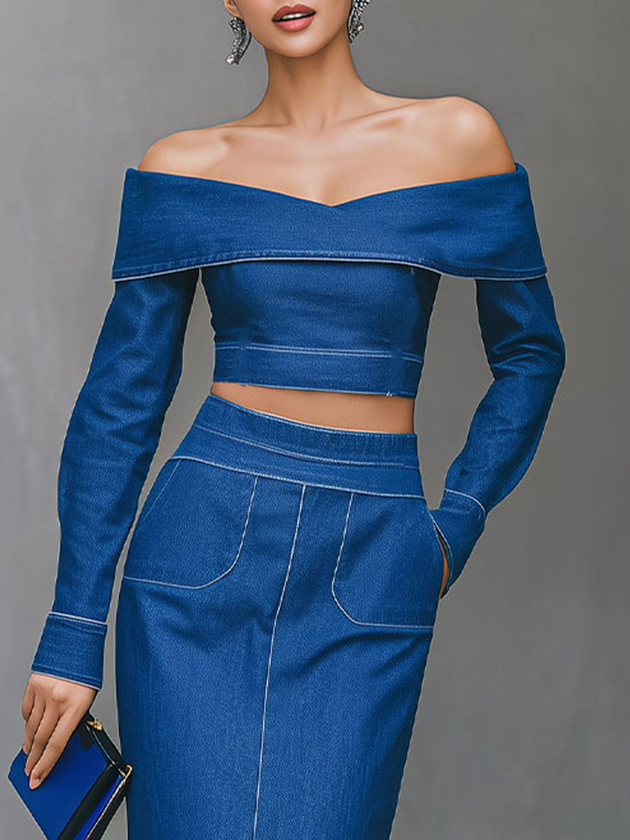 Off-the-Shoulder Denim Crop Top & Midi Skirt Set