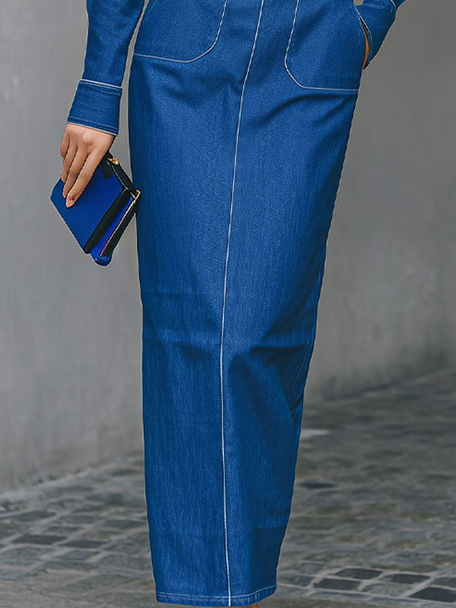 This set reimagines classic denim with playful elegance: the off-the-shoulder neckline adds a romantic touch, while the contrast stitching and functional pockets keep the look grounded in casual cool. Pair it with strappy sandals and a bold clutch (like the styled piece here) for a polished daytime look, or layer with a leather jacket and ankle boots for a edgier vibe—effortlessly versatile for any low-key occasion.