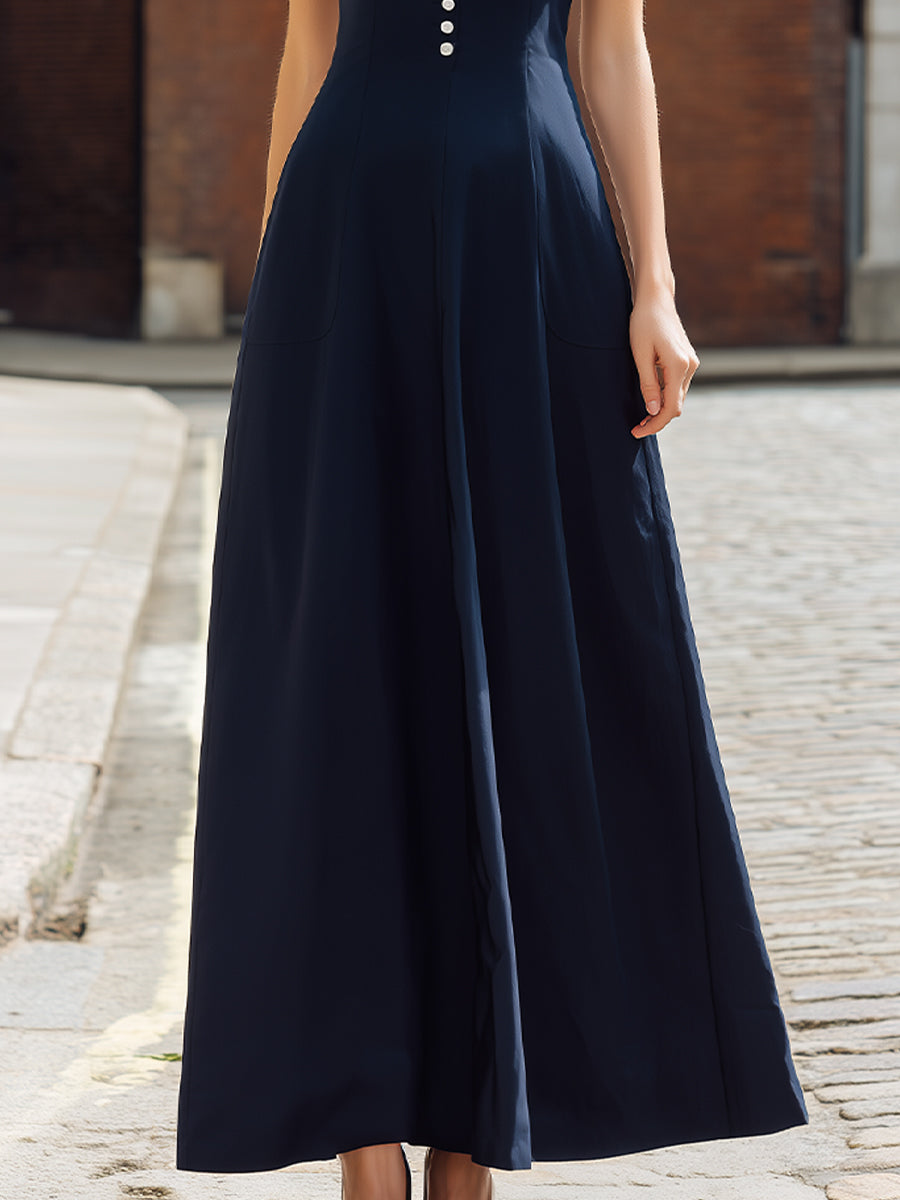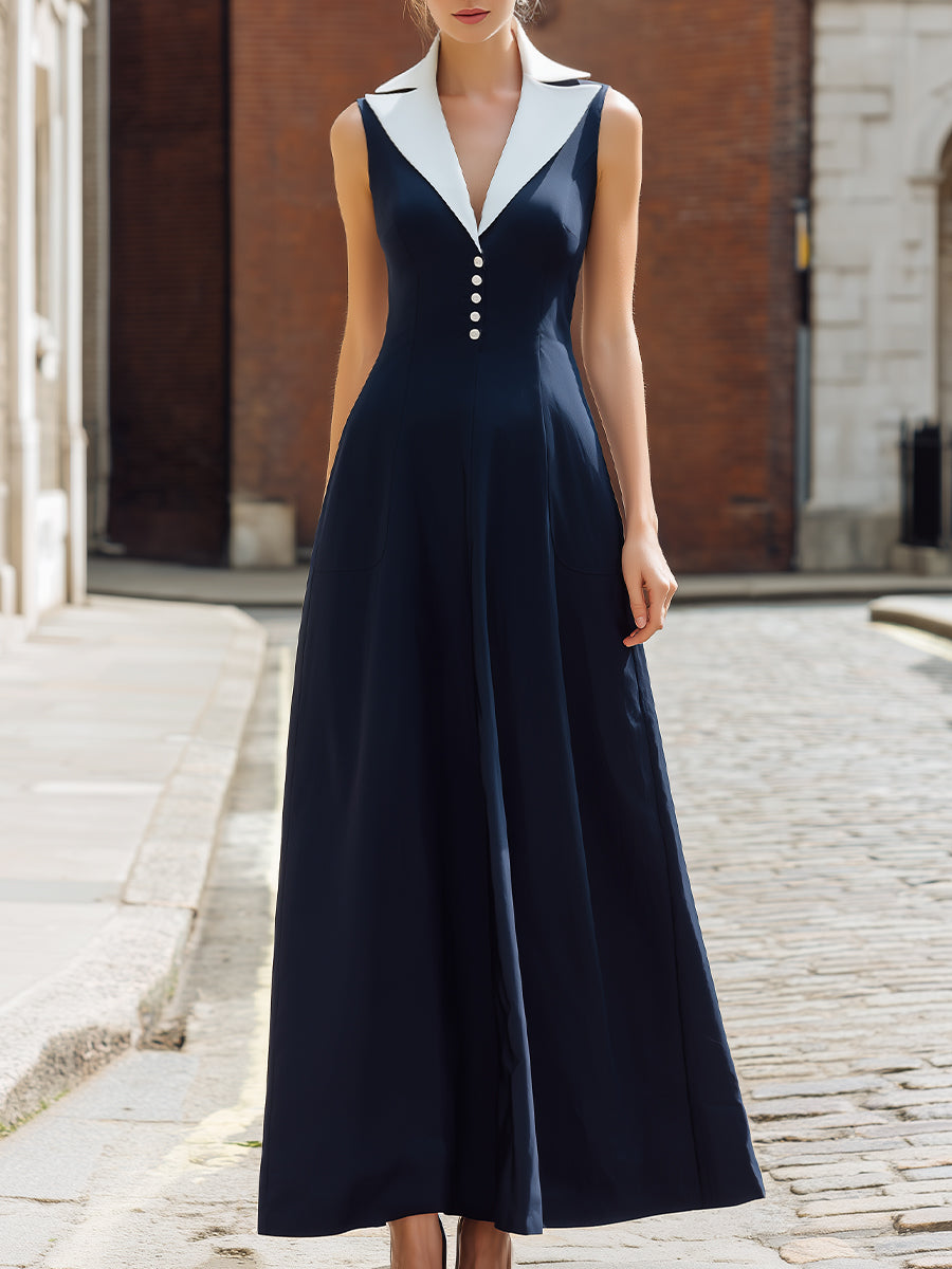 - Design: Sleeveless silhouette with lapel collar, deep V neckline, front button detailing, fitted bodice, and flowing A-line maxi skirt