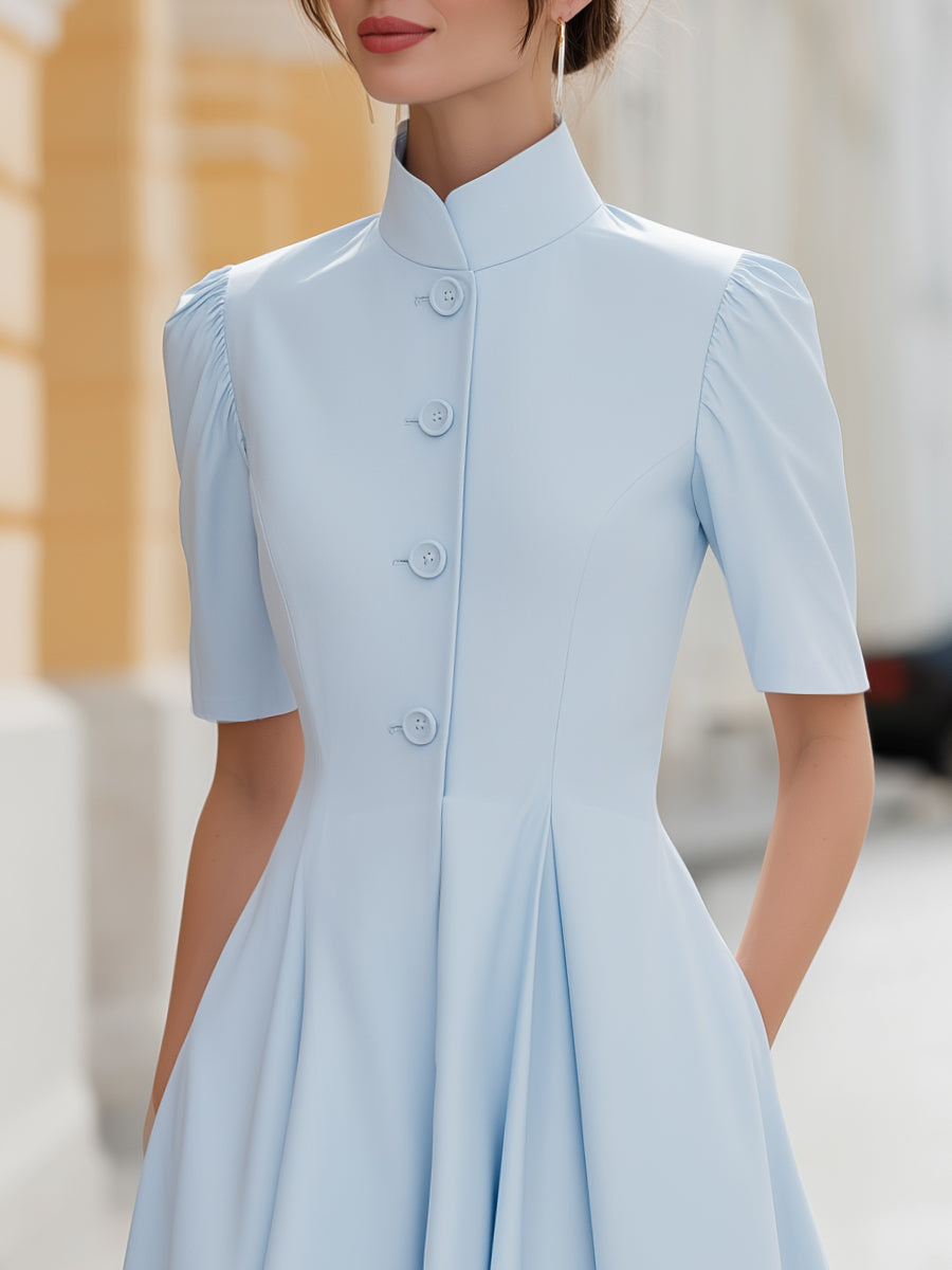 Stand Collar Button-Front Pleated A-Line Midi Dress