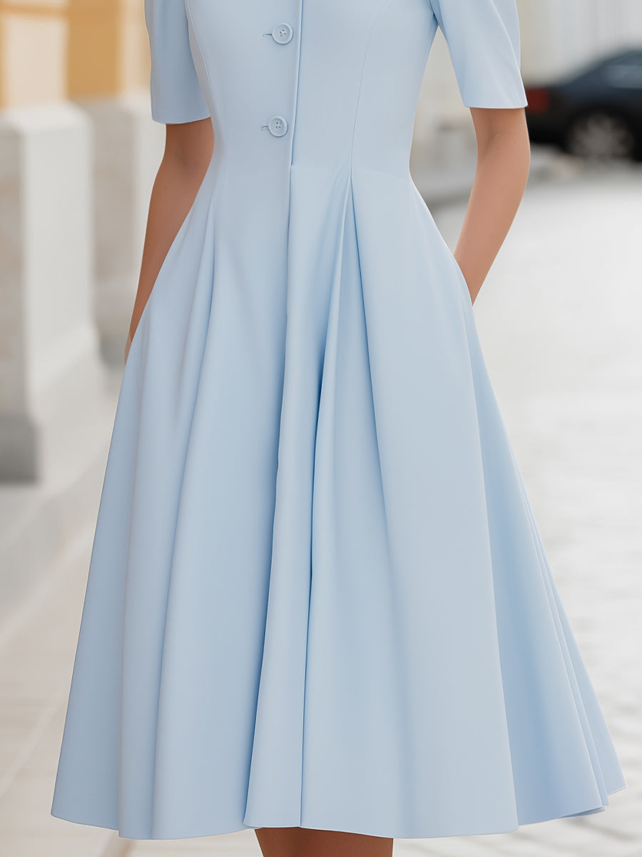 This elegant A-line dress is designed to reflect refined sophistication through structured tailoring and timeless detailing. The stand collar neckline brings a polished and modern edge, framing the neckline with clean lines that enhance the overall elevated aesthetic. A row of front buttons adds a subtle decorative element while reinforcing the dress’s tailored and classic appeal.