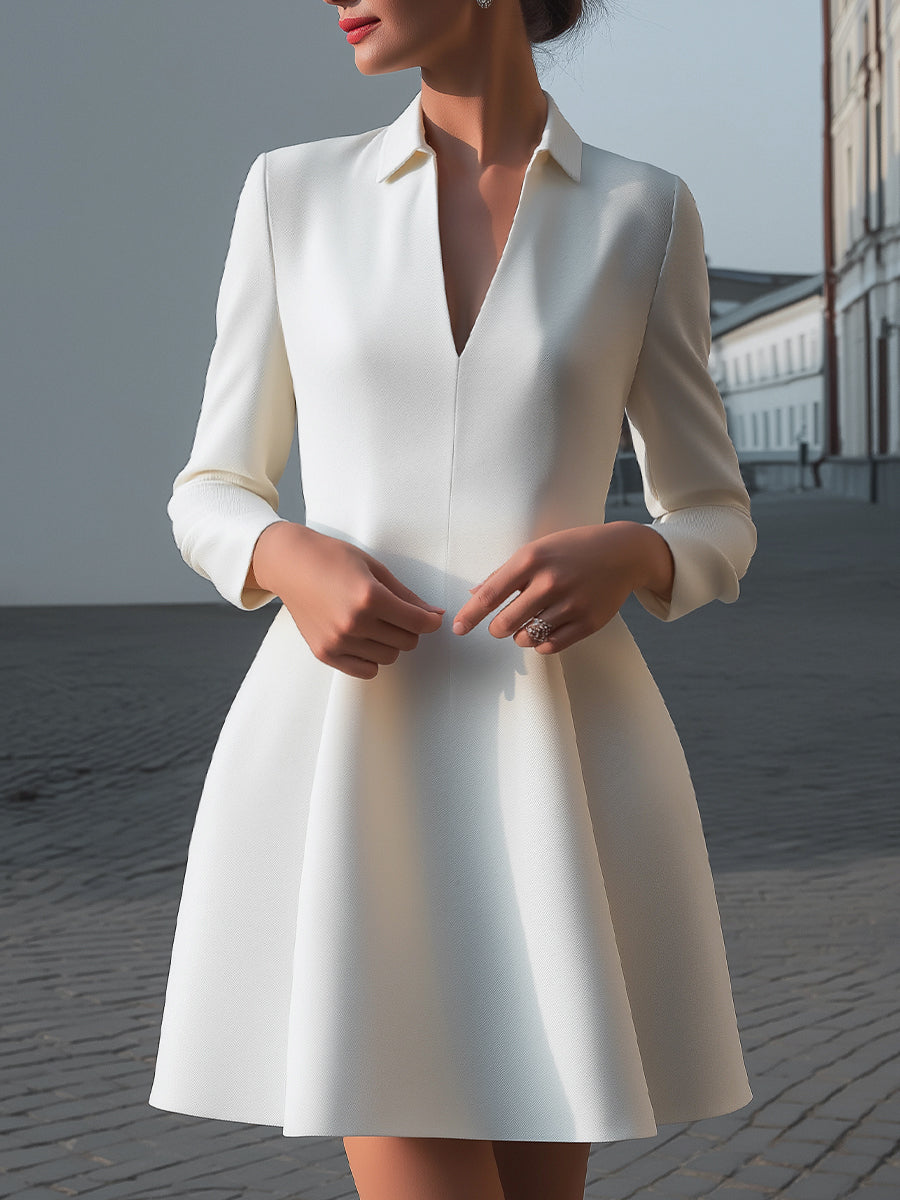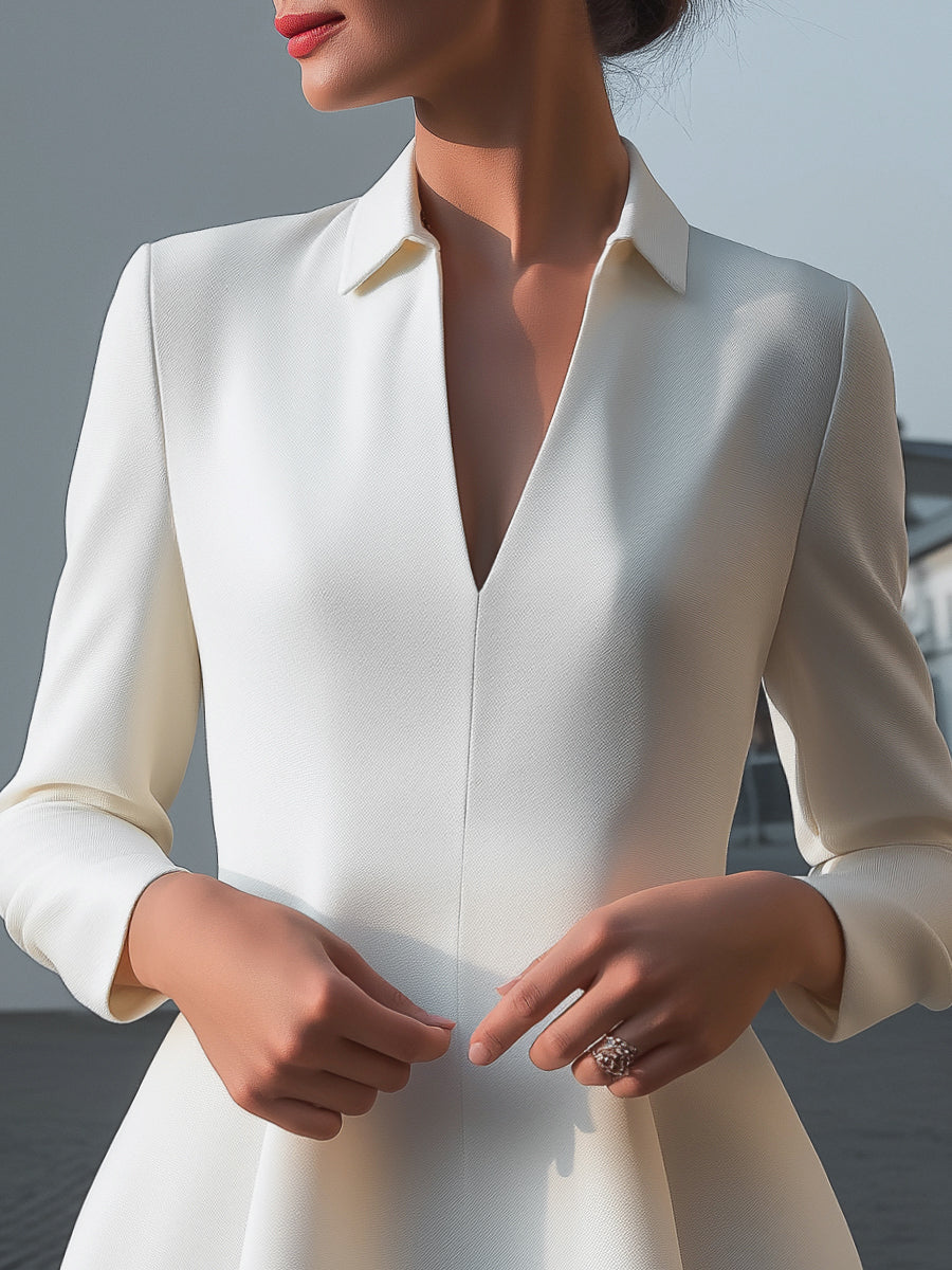 Crafted from a premium structured fabric, the dress maintains a smooth, sculpted shape that flatters the figure without clinging. The notched collar frames the neckline elegantly, while the subtle V-cut adds just the right amount of sophistication. Fitted through the bodice and flaring gently at the skirt, this silhouette creates an effortlessly balanced proportion — poised, confident, and timeless.