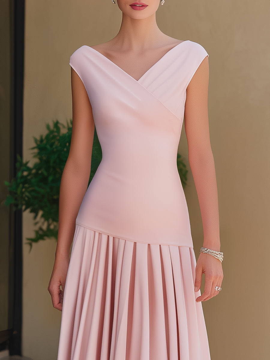 V-Neck Pleated Hem Elegant Midi Dress