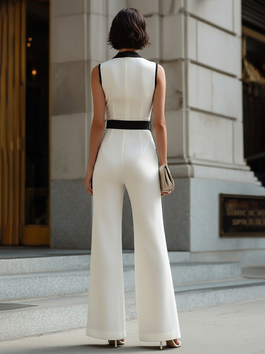 - Design: Sleeveless deep V-neckline with contrast lapel-style trim, sculpted bodice, statement waist tie belt, wide-leg trousers, and vertical contrast piping detail