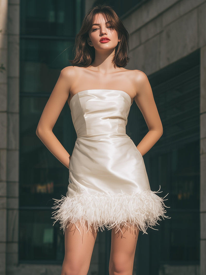 Ivory Strapless Satin Mini Dress With Feather Hem