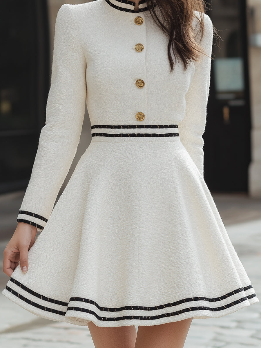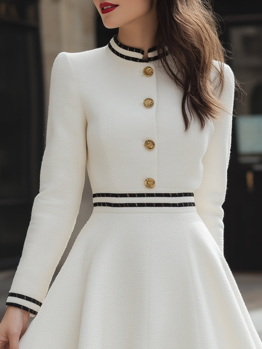 • Design: High-collar dress with contrast trims, gold-tone button detailing, fit-and-flare silhouette