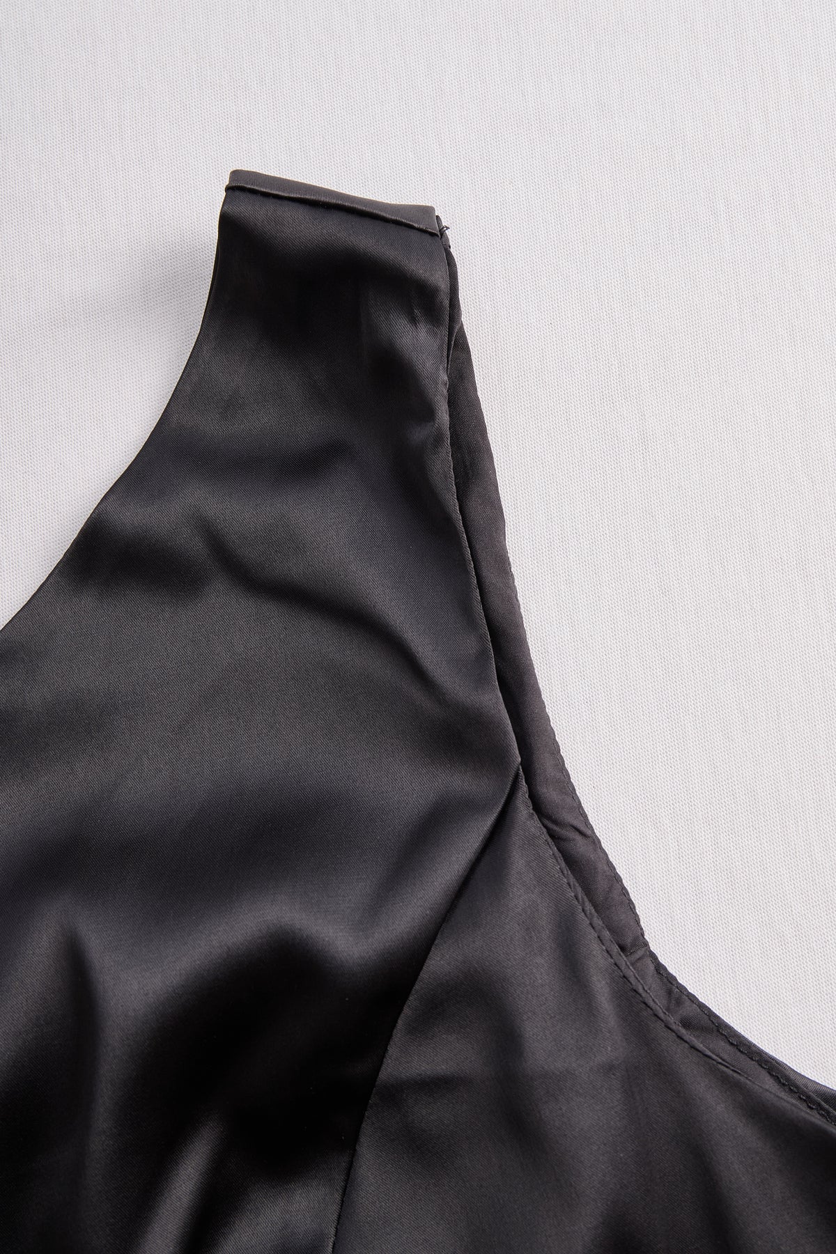 Exude elegance with our one-shoulder black gown, a masterpiece of sophistication and style. The sleek design contours your shape, while the bold slit offers a glimpse of allure. Ideal for black-tie events, this gown combines timeless beauty with contemporary flair, making every appearance unforgettable.