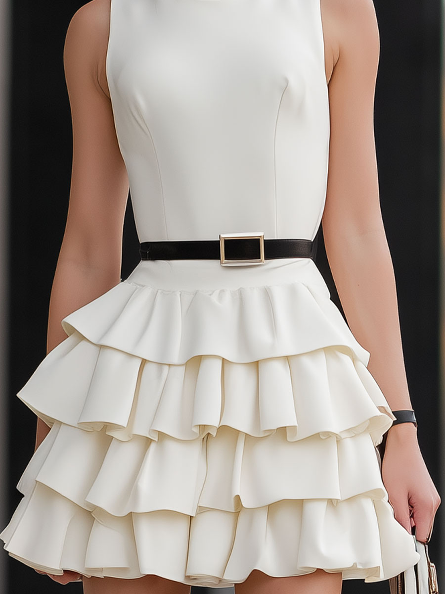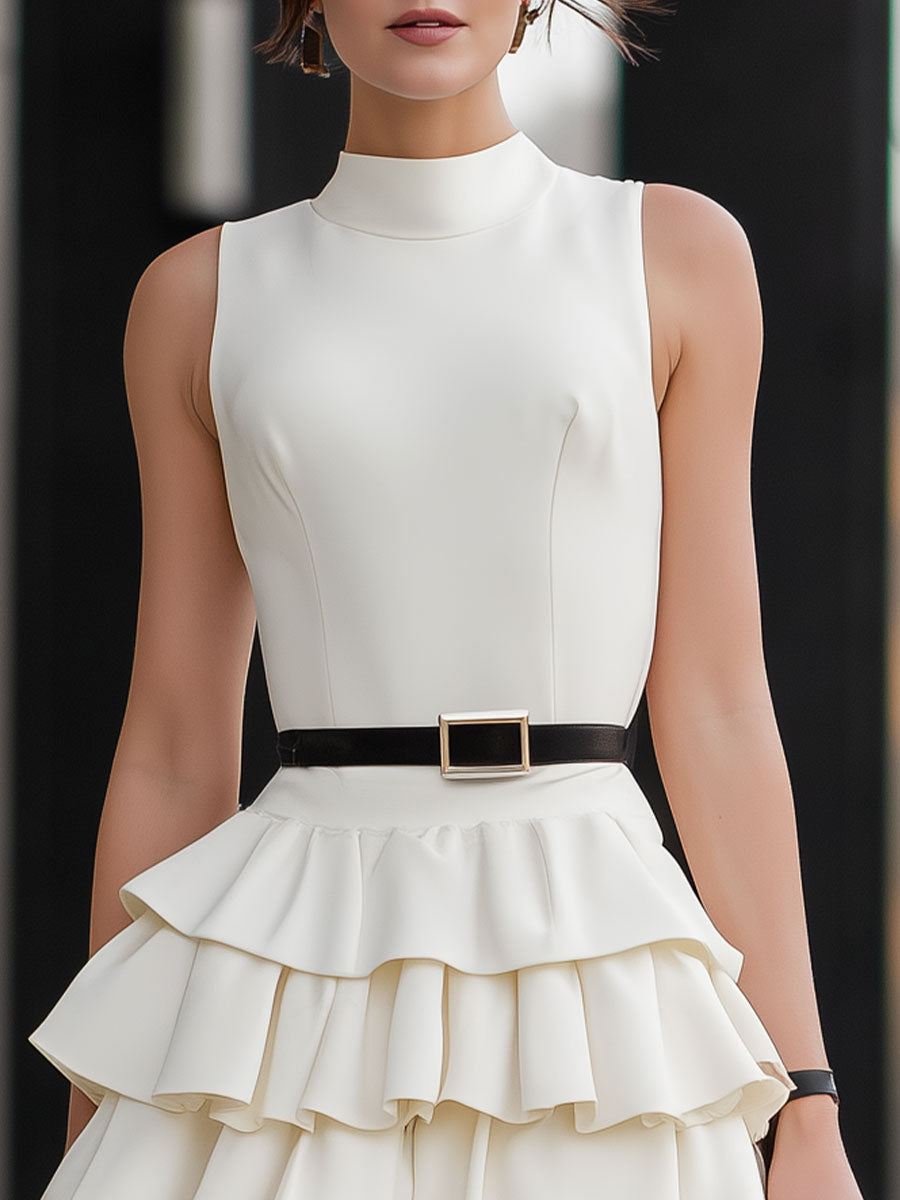 Embrace modern elegance with our Sleek Ivory Mock-Neck Tiered Ruffle Mini Dress. Crafted from smooth, structured ivory fabric (with a subtle matte finish), this dress features a sleeveless mock-neck bodice, a cinched waist (accented by a black leather belt with a gold buckle), and a voluminous tiered ruffle skirt—blending polished minimalism with playful texture.