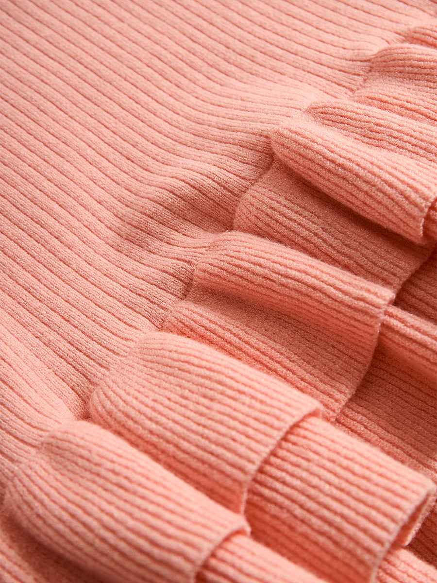 Crafted in a dreamy blush pink shade, this mini dress is your effortless solution for standout style. The soft, stretchy knit fabric ensures lasting comfort and a flawless fit, while the romantic ruffle detailing elevates the entire look. Pair it with heels and a clutch for a polished ensemble, or dress it down with sneakers and a denim jacket for everyday chic.