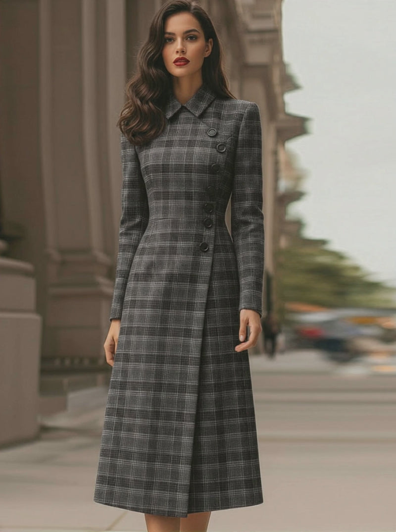 Elegant Plaid Asymmetric Button - Front Midi Dress