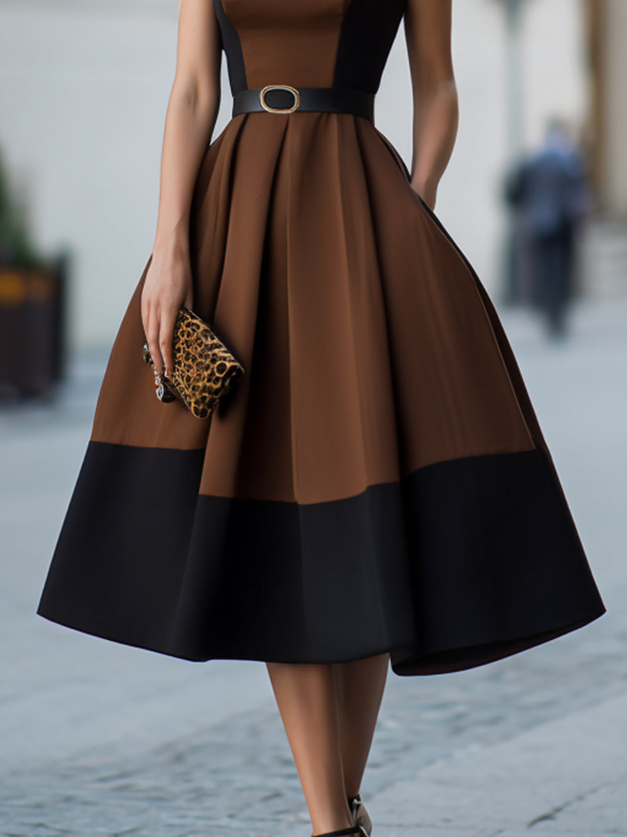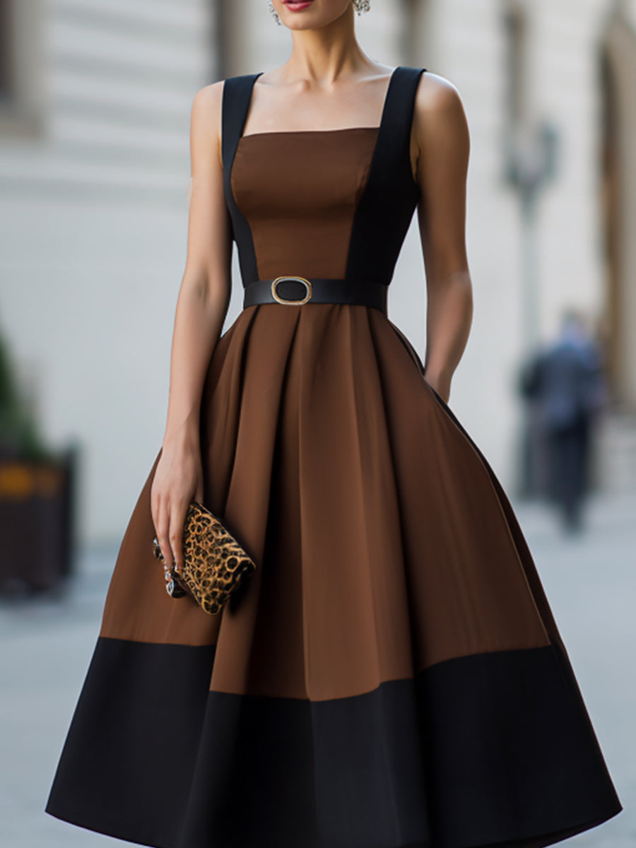 Mooyius presents a refined midi dress that blends structured elegance with modern contrast design, creating a striking yet timeless silhouette. This piece features a clean square neckline that frames the collarbone with understated sophistication, while wide shoulder straps provide both support and a bold architectural presence. The bodice is tailored for a smooth, sculpted fit, enhanced by contrasting panel details that visually contour the waist and elongate the upper body.