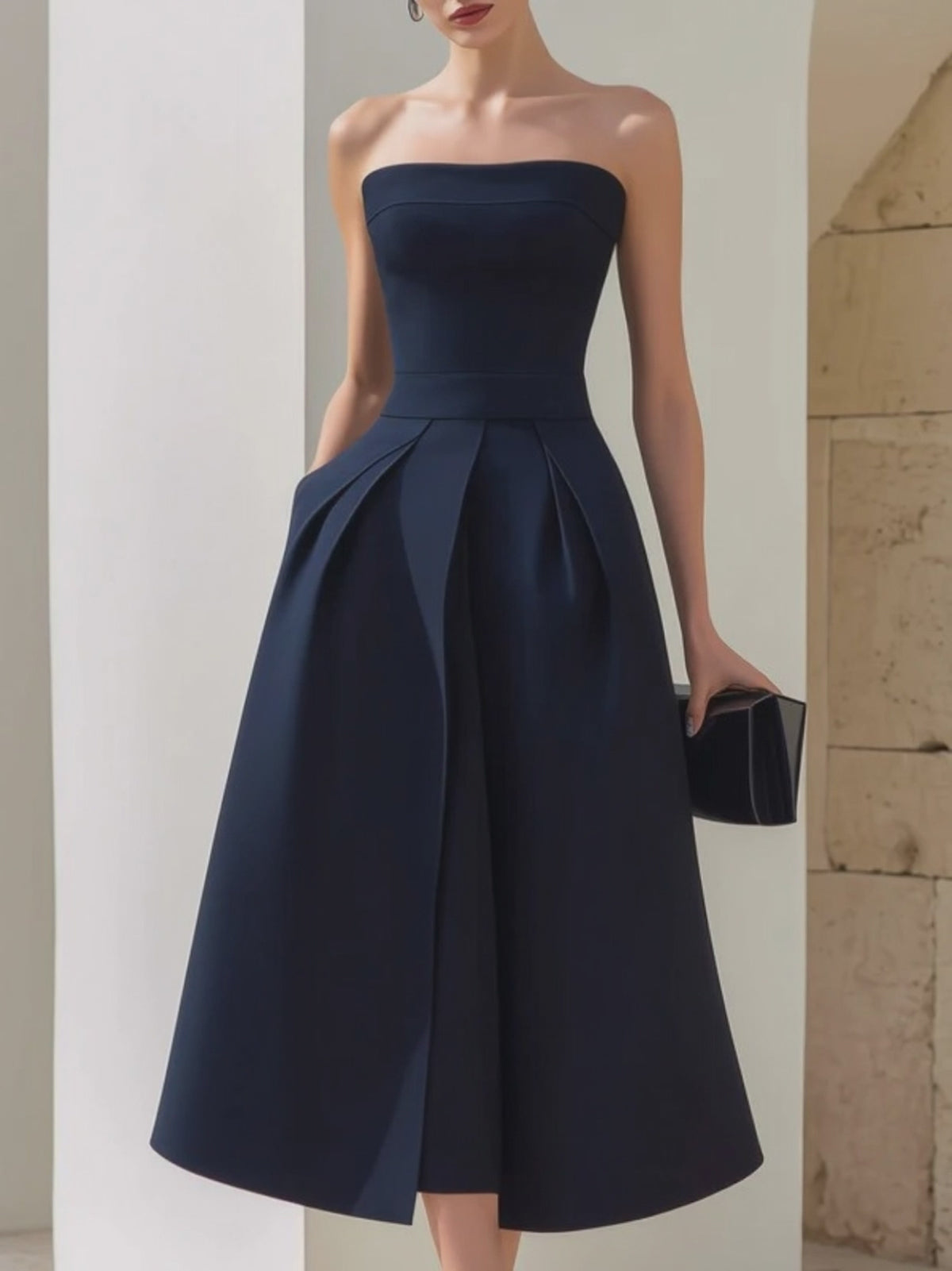 Designed to embody timeless sophistication and sculptural elegance, this strapless midi dress delivers refined structure with modern femininity. The clean architectural lines and voluminous skirt create a dramatic yet balanced silhouette, perfect for formal occasions and elevated evening wear.The strapless neckline is softly contoured to frame the collarbone and shoulders with understated grace. Its structured bodice is carefully tailored to sculpt and support, creating a smooth, defined upper silhouette while enhancing natural curves. The fitted waistline transitions seamlessly into a full pleated skirt, where deep inverted pleats introduce dimension, movement, and couture-inspired volume.