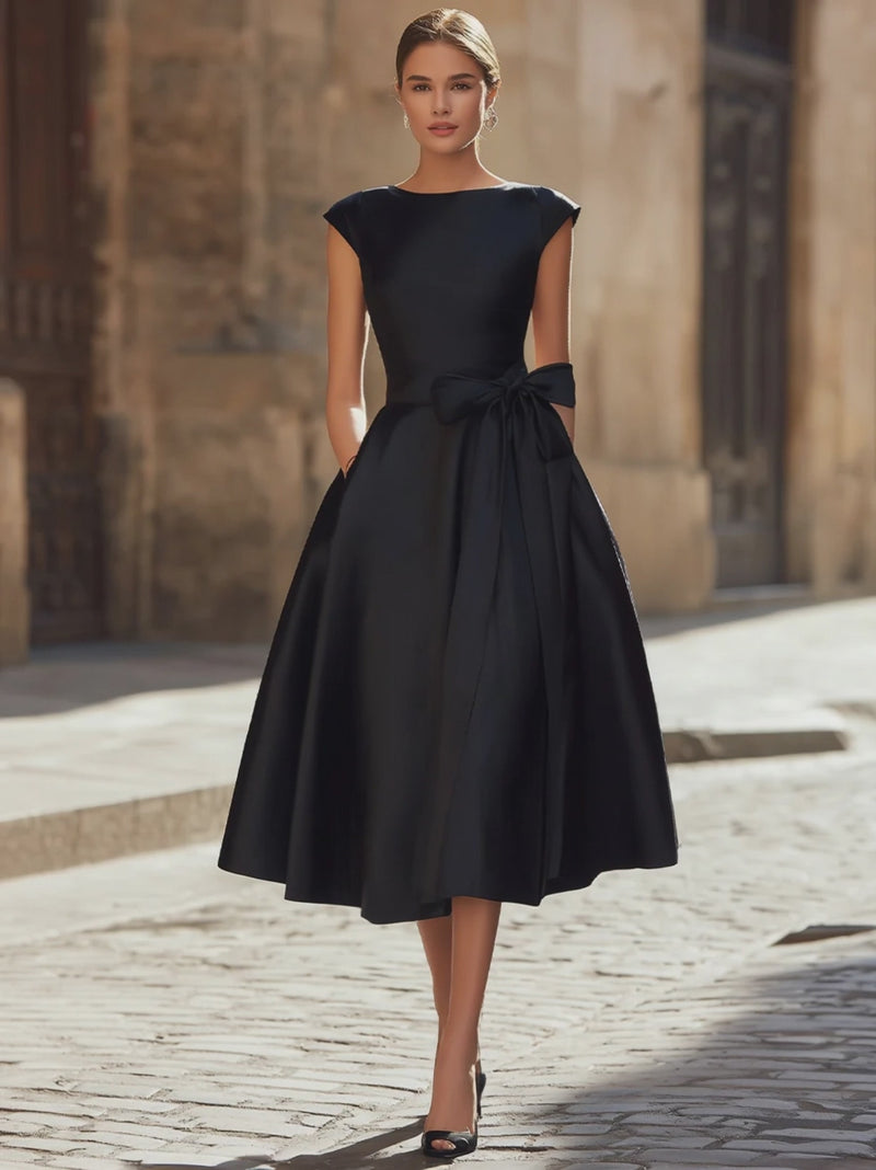 Timeless Elegance Boat-Neck A-Line Midi Dress With Oversized Side Bow
