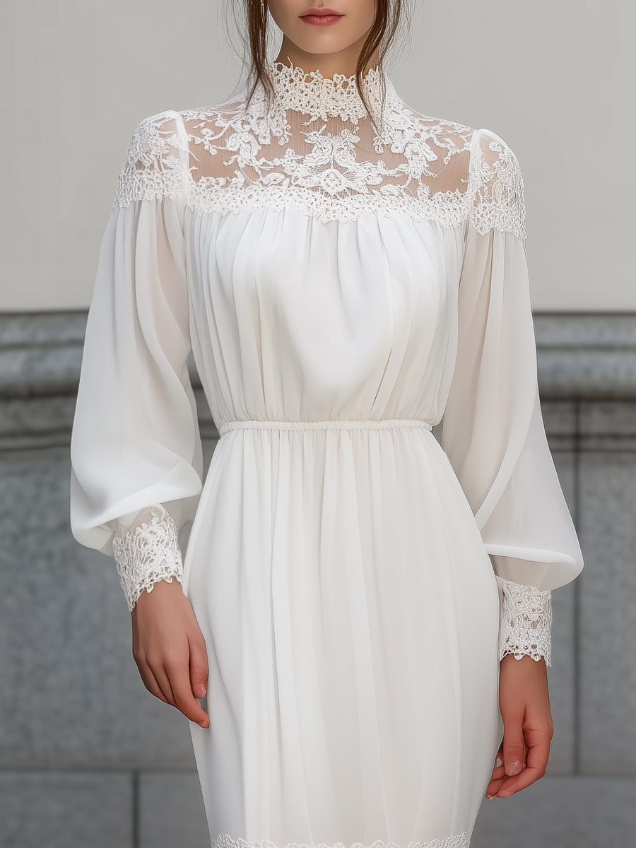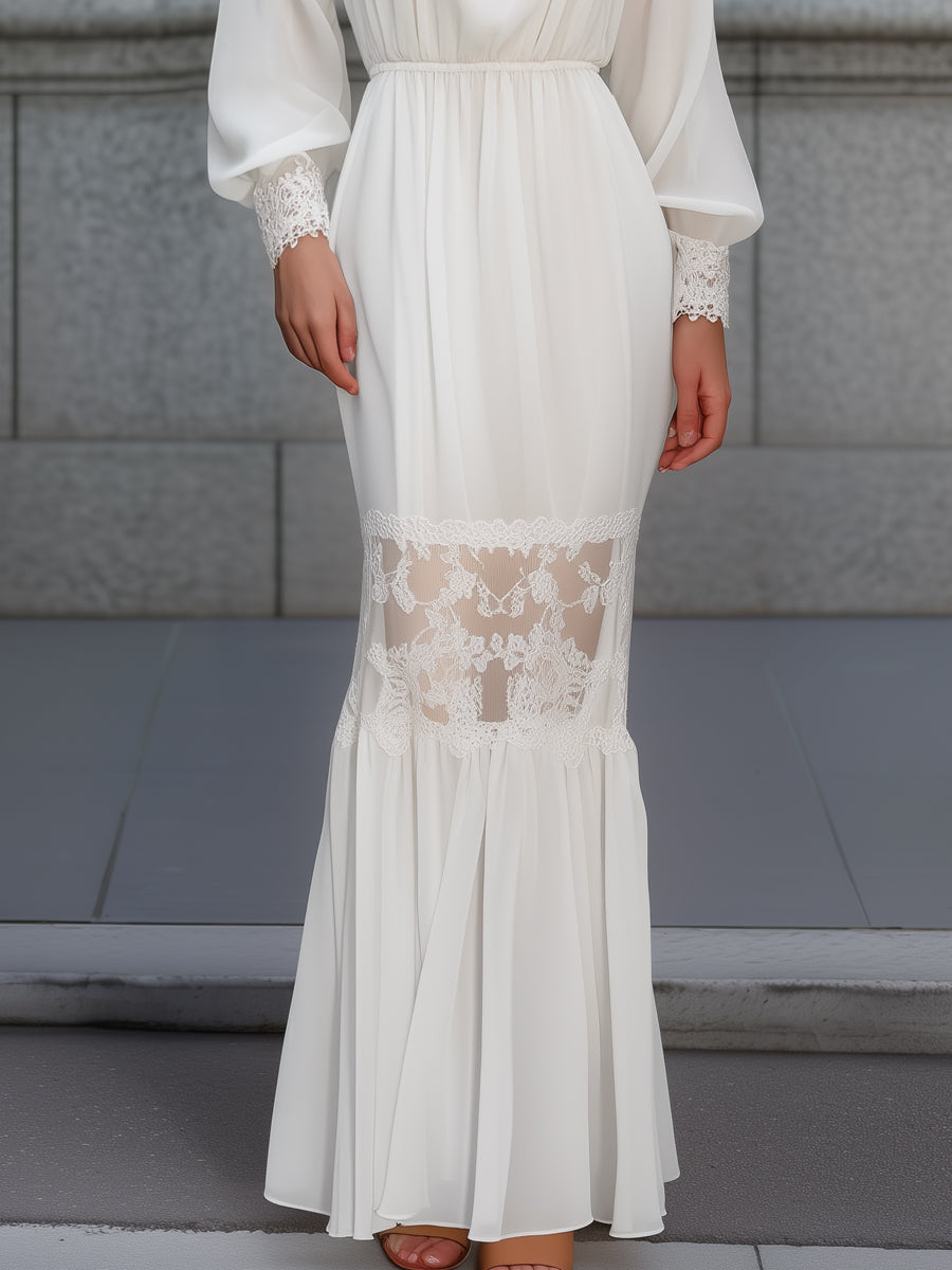 • Design:High lace neckline, sheer lace yoke, long sleeves with lace cuffs, defined waist, lace panel insert, and flared maxi hem