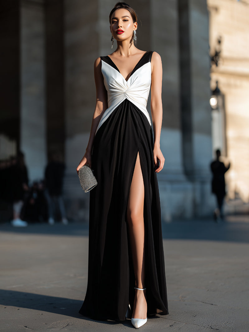 Twist Front Contrast Panel High-Slit Maxi Dress