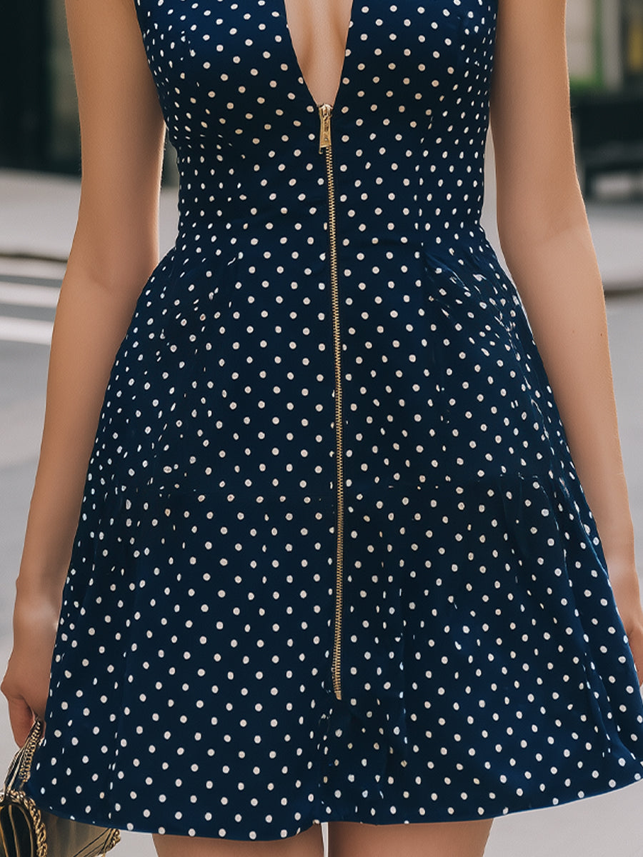 Navy Sleeveless Halter V-Neck Zip-Front Polka Dot Mini Dress