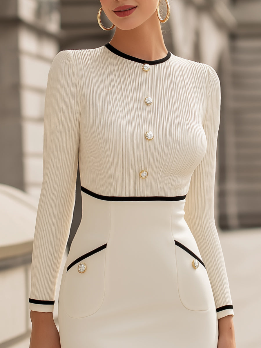 Mooyius presents an elegant knit-panel dress that effortlessly blends refined structure with understated luxury. The upper bodice is crafted with a delicate vertical textured knit, offering soft dimension and subtle sophistication. Each button is thoughtfully placed to enhance the clean, elongated line of the silhouette, creating a polished and statuesque effect.