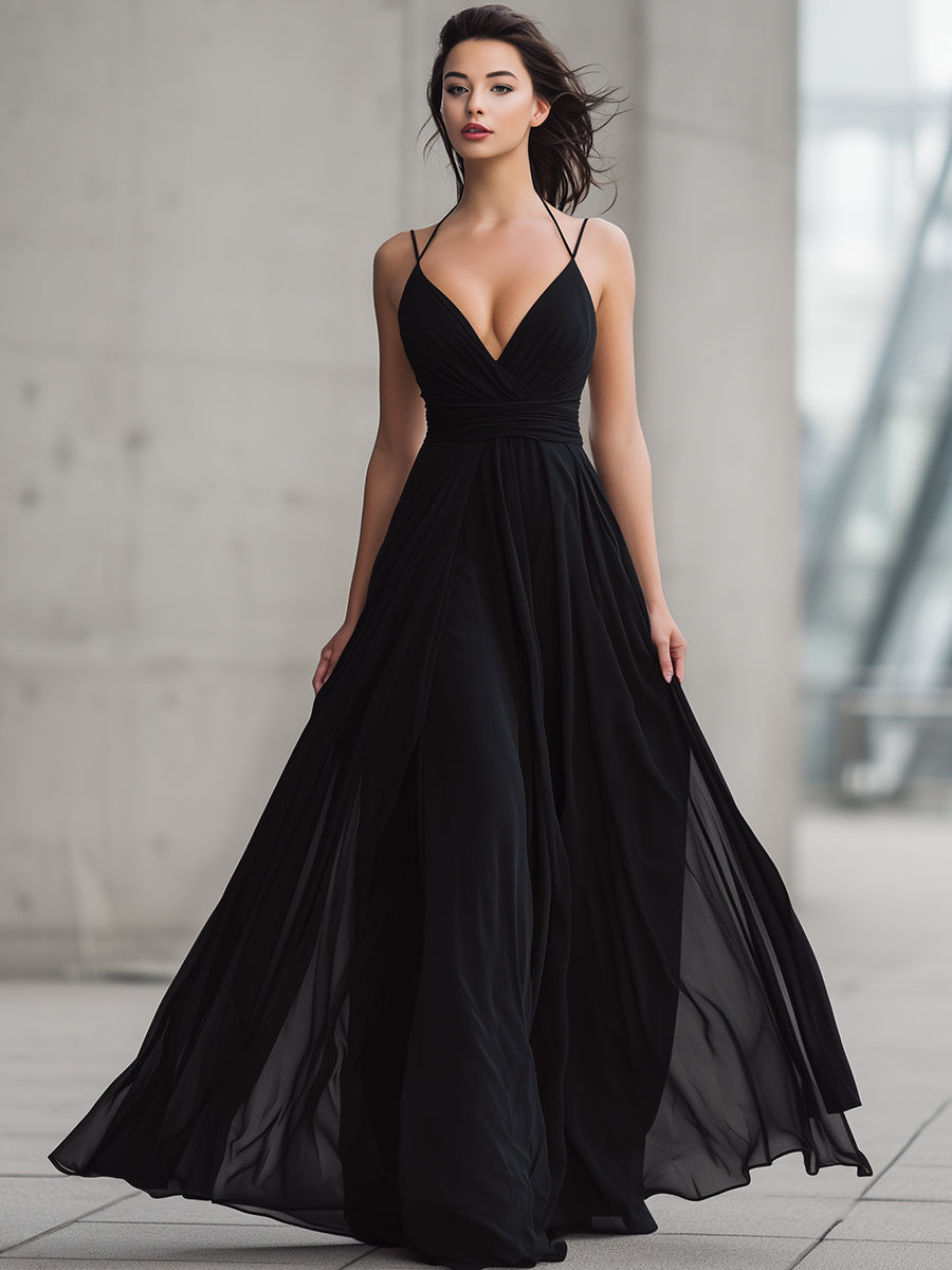 Graceful, fluid, and irresistibly feminine, the Ethereal Black Chiffon Spaghetti-Strap Evening Gown captures the quiet drama of effortless movement. Designed for women who embrace elegance with natural ease, this gown transforms every step into a soft, sweeping statement. The bodice features a delicately draped crossover design that enhances the neckline with refined sensuality. Slim double straps frame the shoulders, creating a modern, minimalistic contrast to the gown’s voluminous skirt. The waistline is carefully ruched to sculpt and elongate the figure, offering both support and flattering definition.