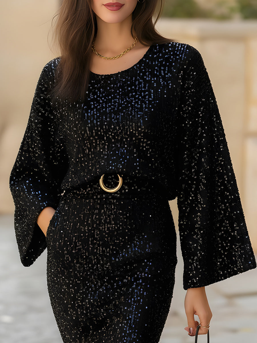 Elevate your evening wardrobe with this luminous sequin-knit dress, crafted to bring effortless sophistication to every special moment. The fabric is densely adorned with fine, light-catching sequins that create a refined shimmer—elegant, modern, never overpowering. Designed with a relaxed round neckline and soft draping through the bodice, it offers comfort while maintaining a polished silhouette.