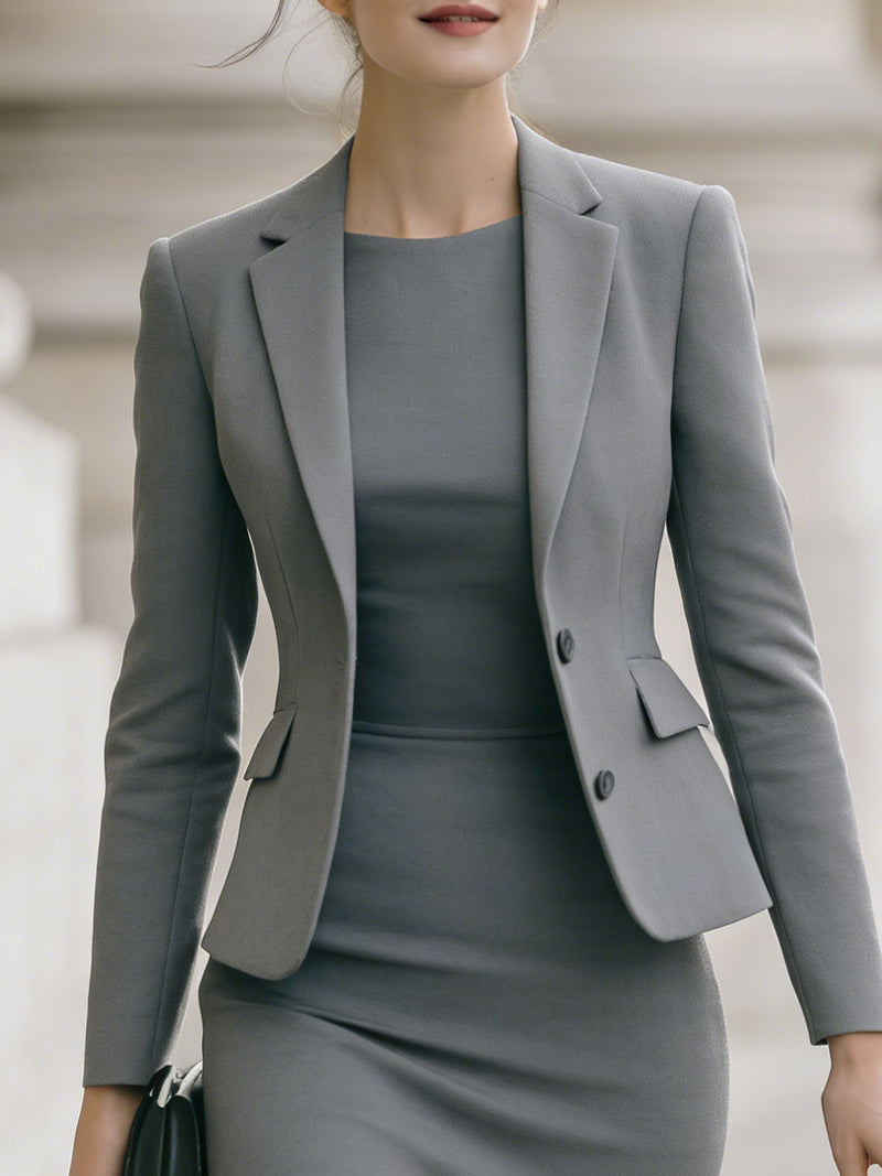 Navy Mandarin-Collar Peplum Blazer & Midi Skirt Suit