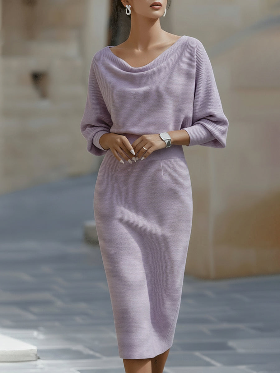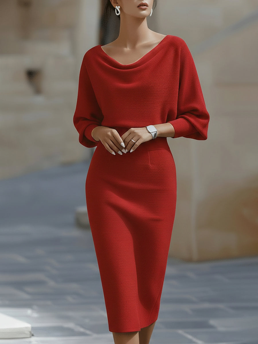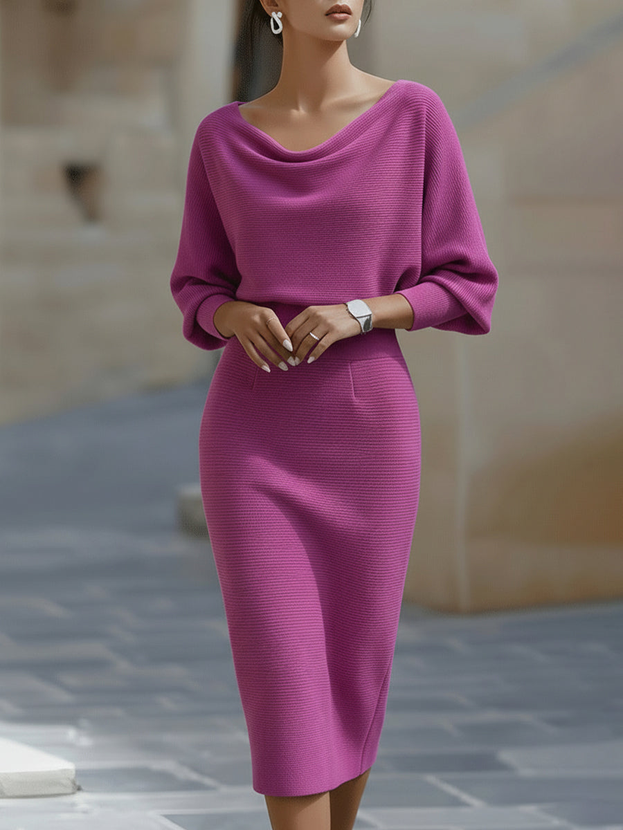 • Design: Draped cowl neckline, batwing long sleeves, and a form-fitting midi pencil skirt that accentuates the waistline for a sculpted silhouette