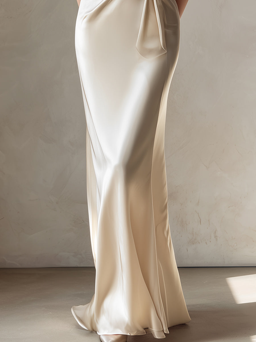 Ivory Draped Satin Column Dress With Sculpted Waist Detail